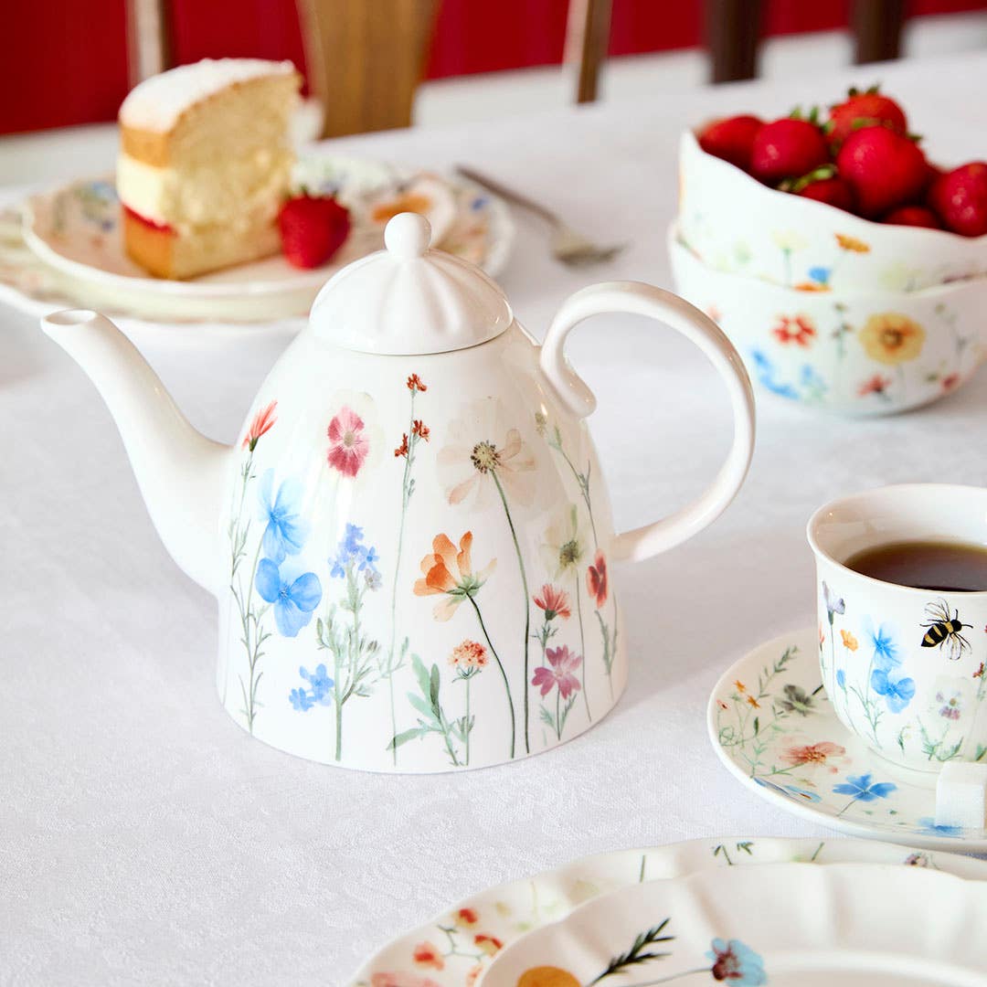 The Caprice teapot showcases colourful wildflowers and soft watercolour detailing, wrapping beautifully across its rounded form. Featuring delicate blooms, greenery, and subtle bee accents, it brings a bright, nature inspired feel to your daily cup of tea. This coordinated piece adds a cheerful, uplifting touch to special gatherings or everyday rituals.