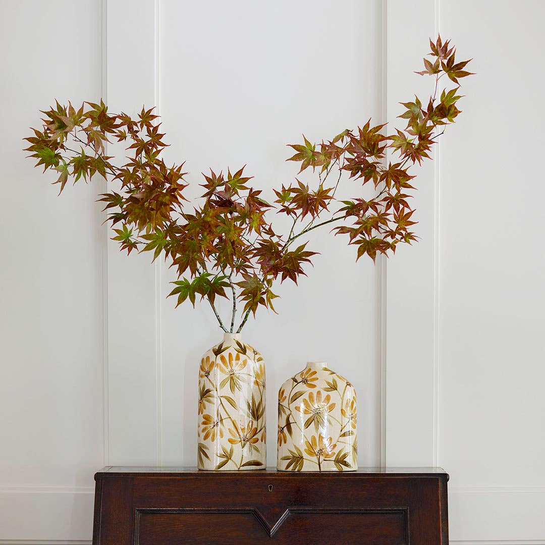 The Evergreen Rectangular Ceramic Vase features a tall, elegant silhouette adorned with hand?painted branches in warm green and rust tones. Its natural, botanical design creates a calming decorative piece that suits both modern and classic interiors. A striking vase that brings a fresh, nature?inspired feel to any room.