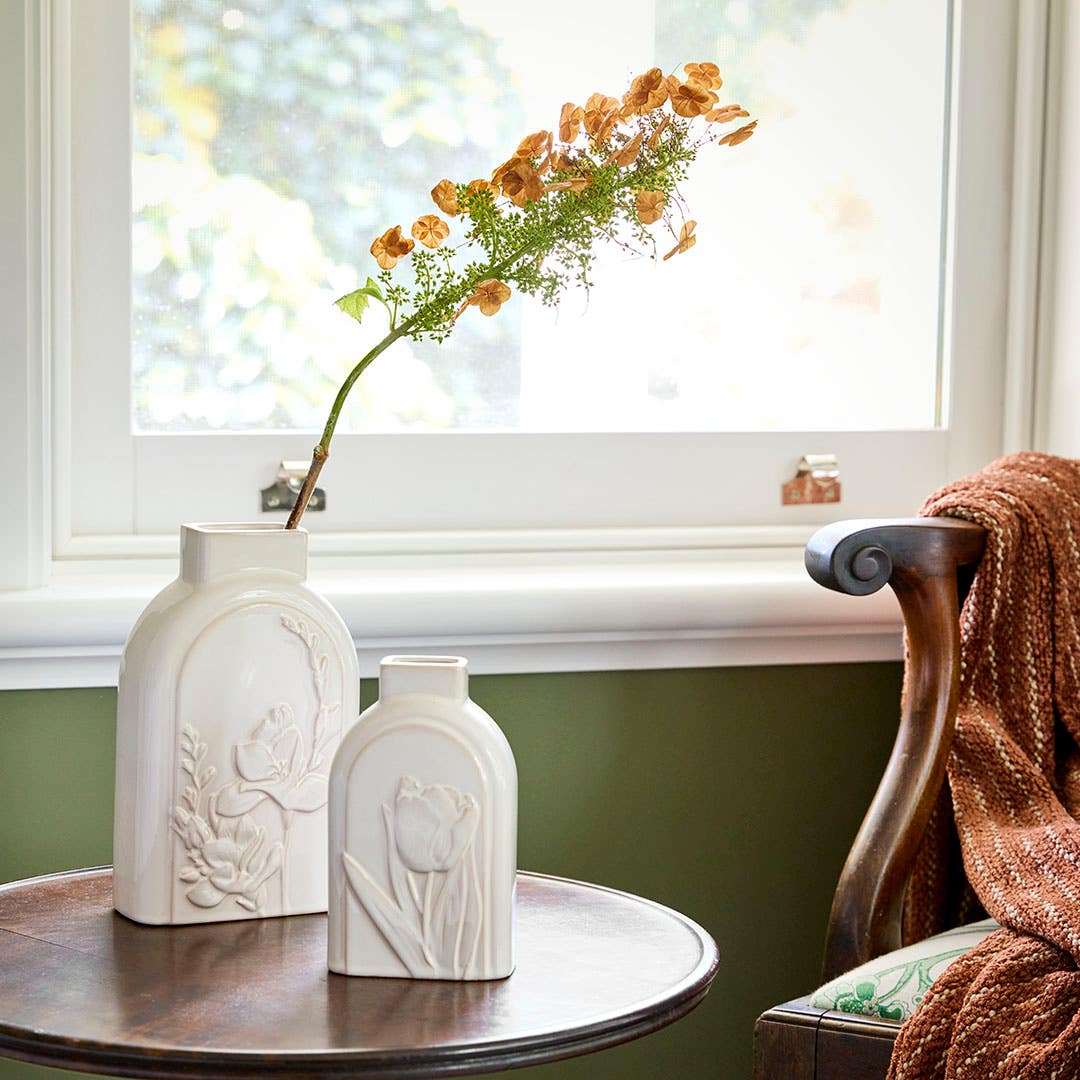 The Hansel Ceramic Vase in Medium showcases a delicate botanical relief design, finished in a smooth beige tone that pairs effortlessly with any interior. Its medium height makes it perfect for smaller arrangements or layered styling. A subtle, decorative accent that brings elegance to your home.