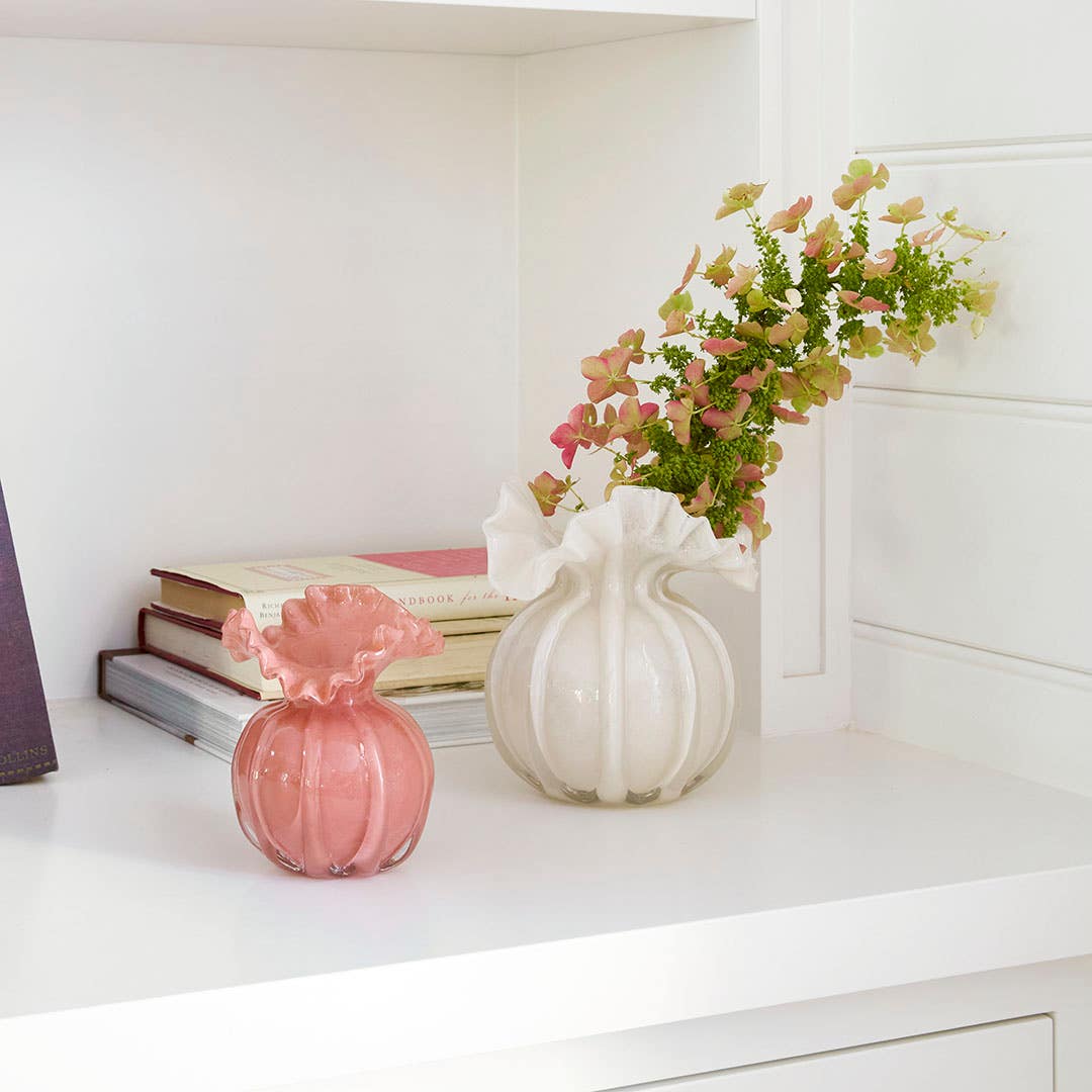 The Ruffled Glass Vase in large brings soft texture and sculptural shape to your space. Crafted from soda lime glass, its rounded body is finished with a gently ruffled rim that adds movement and character. Its off white tone has a subtle translucency, making it an easy piece to style with fresh blooms or as a standalone accent on shelves and tables.